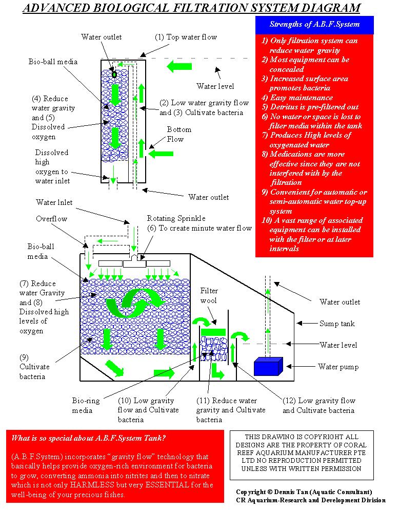 Filtration system is the 'heart’ and indeed by far the most important piece of equipment in the aquarium. For this reason, CR Aquarium has spend over 10 years in R & D, perfecting such a system. We are proud to announce that we have designed the A.B.F.System which has been tested by the Maritime Academy of Singapore. (SP) to be an effective and yet an affordable model. Bearing in mind, the aquarium is a'closed environment'., i.e. to say your fishes eat and defecate in the same space, an efficient filtration must not only provide the flush but also clear the waste. The A.B.F.System does just that!. Unlike so many other types of filtration systems available such as mechanical, chemical, gravel, coral chips etc., the A.B.F.System is far more effective because it is a NEUTRAL system.