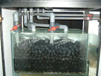 How does the Advanced Biological Filtration System works? The most important function of the A.B.F.System is its ability to breakdown and removal of organic pollutants such as ammonia and nitrites using bacteria. The A.B.F.System also incorporates 'gravity flow' principle. Unlike many other designs available in the market that basically 'flushes' the system, rendering bacteria cultivation almost impossible, the A.B.F.System does just the opposite. The water flow gravity in A.B.F.System is reduced significantly by our specially designed rotating sprinkler mechanism. The large quantity of bio balls hold and trap minute water droplets resulting in an unusually high concentration of surface area on which bacteria can settle and remove pollutants by process of oxidation. The water gravity flow is then further reduced by bio-rings allowing more bacteria cultivation before it is returned to the tank.